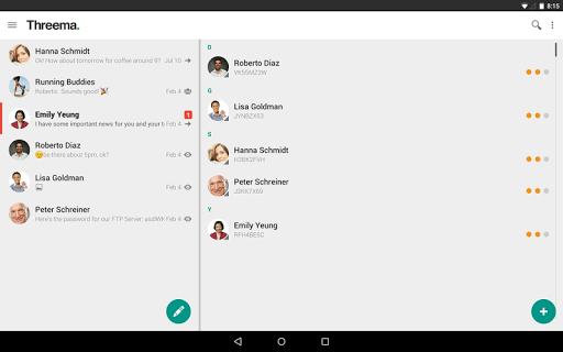 Threema is a mobile messaging app that puts security and privacy first. With true end-to-end encryption, you can rest assured that only you and the intended recipient can read your messages. You can use Threema completely anonymously, without giving away personal information such as phone numbers or email addresses. Your messages will be deleted from our servers immediately after being delivered. Therefore, you're perfectly protected against data abuse.
