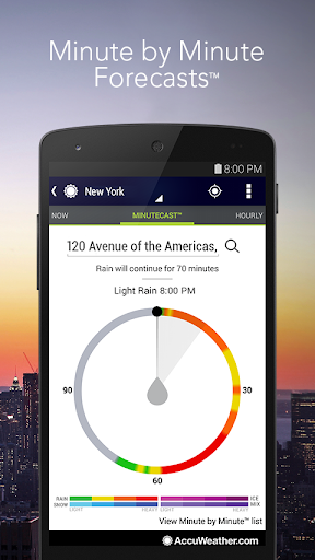 Stay connected to the latest weather conditions with AccuWeather. Now supporting Android Wear™, this free app features the new AccuWeather MinuteCast®, the leading minute-by-minute precipitation forecast, hyper-localized to your exact street address. AccuWeather offers the same Superior Accuracy™ and great experience across all Android smartphones and tablets, and Android Wear. minute-by-minute precipitation forecasts for the next two hours hyper-localized to your exact street address or GPS location. Includes precipitation type and intensity, and start and end times for precipitation. Available for the contiguous United States, Canada, United Kingdom, Ireland, Japan, France, Germany, Belgium, Switzerland, Netherlands, Luxembourg, and a growing list of global locations.