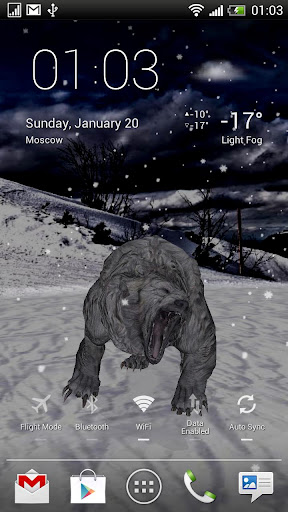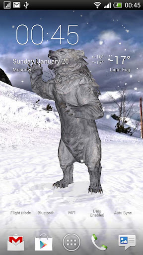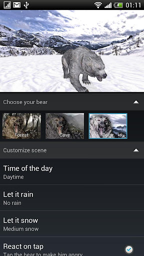 Meet the bear, real and angry. Now on your home screen as an amazing interactive live wallpaper! Featuring true 3D animated bear in beautiful native environments. Choose between forest, cave or north pole, make it rainy or snowy, daytime or evening Touch the bear to make him angry! Shake your device to make the bear shake off! Great for both phones and tablets. Take care of the bear, he is now yours!