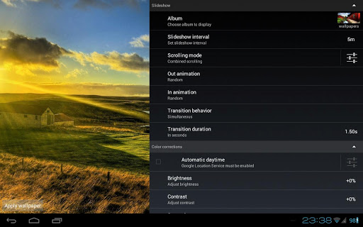 You can use Slideshow HD Live Wallpaper both as live wallpaper and regular app. You can customize slideshow modes, timings, in/out transition effects, transition time, order and more! You can apply color corrections to adjust brightness, contrast and saturation of your photos. You can even use a special daytime feature to simulate automatic daytime (Google Location Service must be enabled).