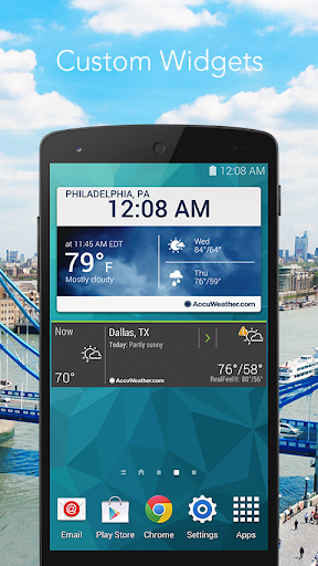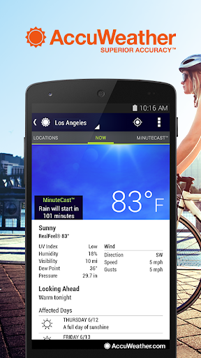 Stay connected to the latest weather conditions with AccuWeather. Now supporting Android Wear™, this free app features the new AccuWeather MinuteCast®, the leading minute-by-minute precipitation forecast, hyper-localized to your exact street address. AccuWeather offers the same Superior Accuracy™ and great experience across all Android smartphones and tablets, and Android Wear. minute-by-minute precipitation forecasts for the next two hours hyper-localized to your exact street address or GPS location. Includes precipitation type and intensity, and start and end times for precipitation. Available for the contiguous United States, Canada, United Kingdom, Ireland, Japan, France, Germany, Belgium, Switzerland, Netherlands, Luxembourg, and a growing list of global locations.